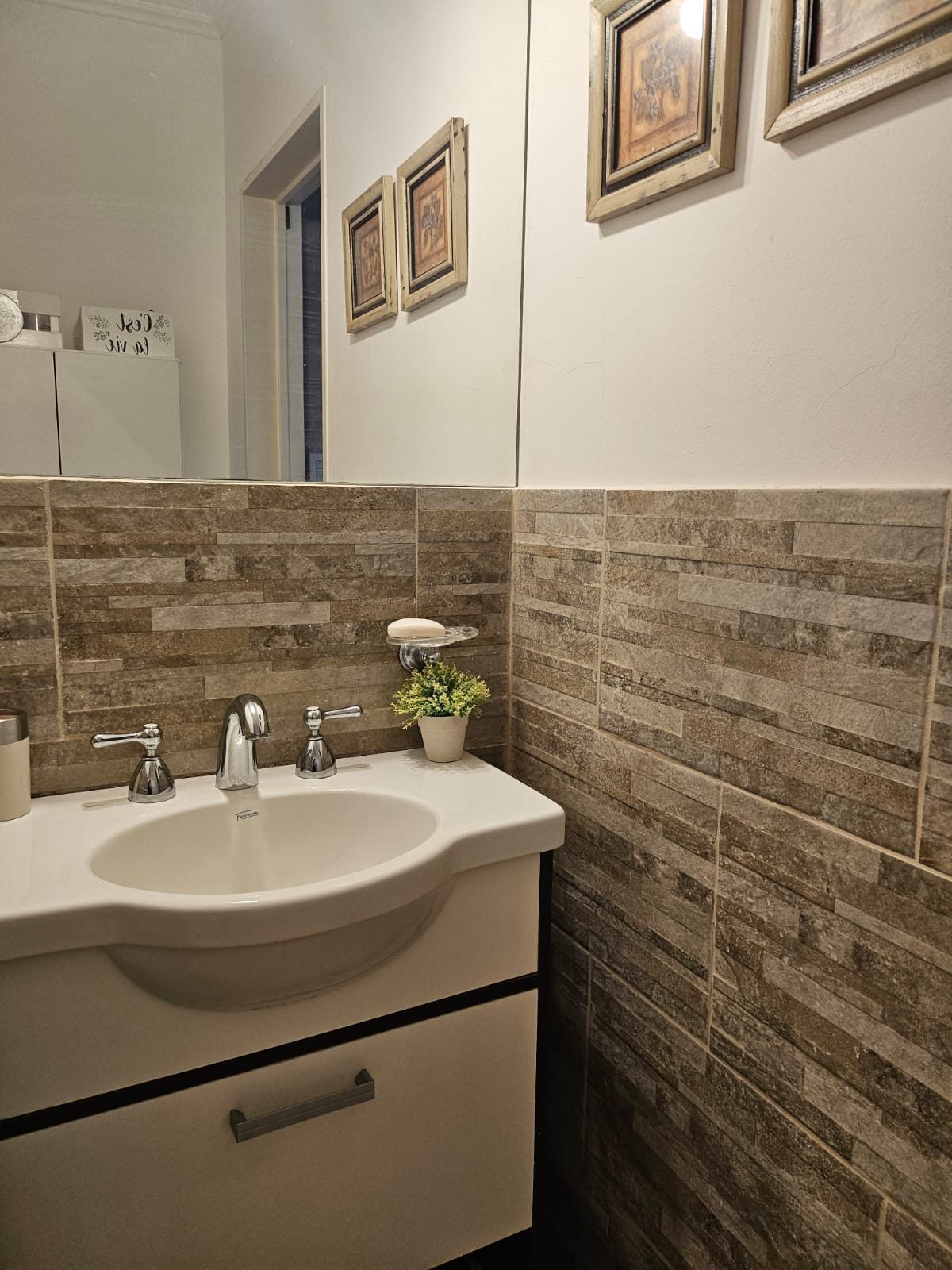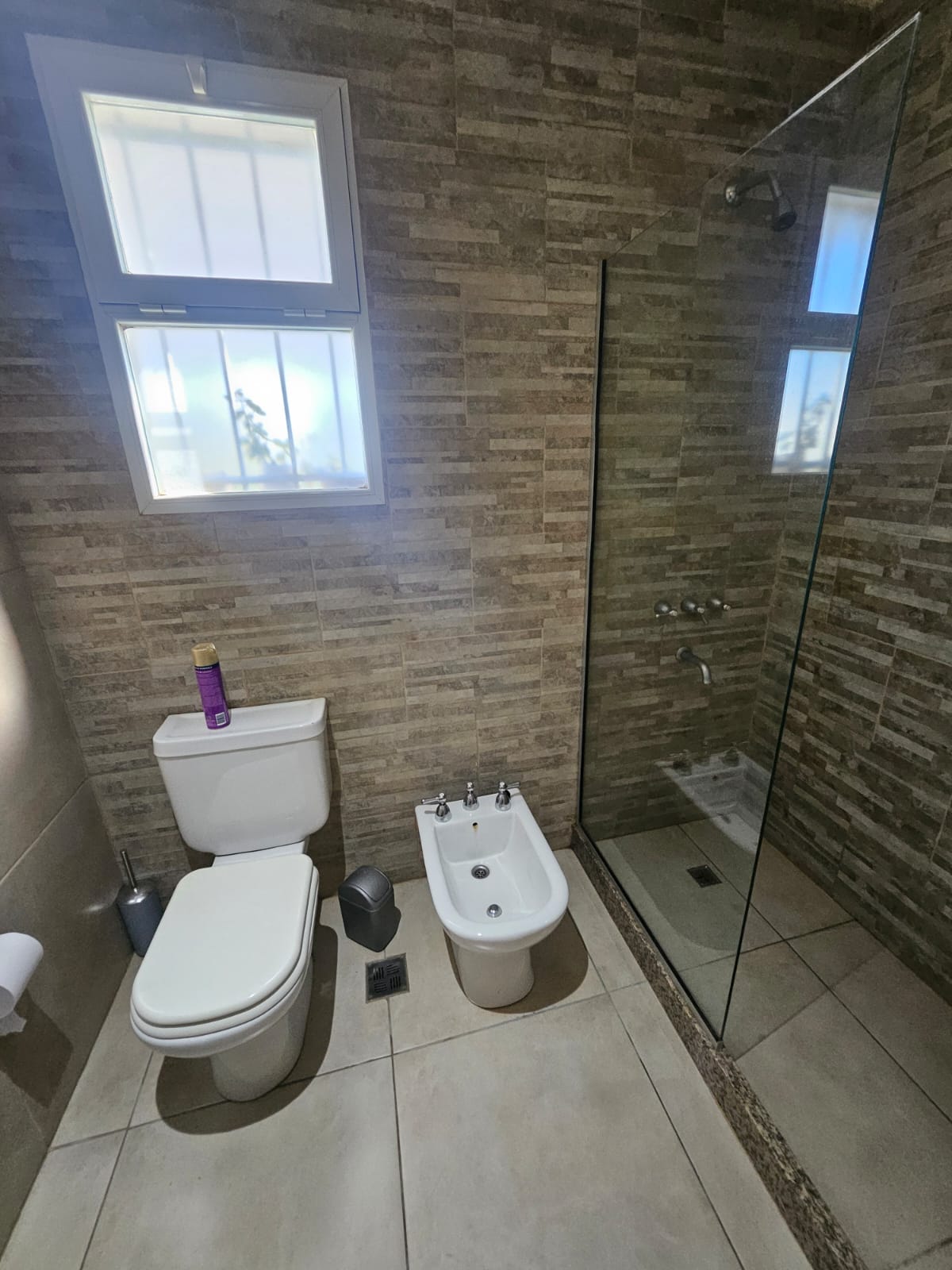 Dos baños, un toilette de recepción y otro completo con antebaño y mampara de vidrio.