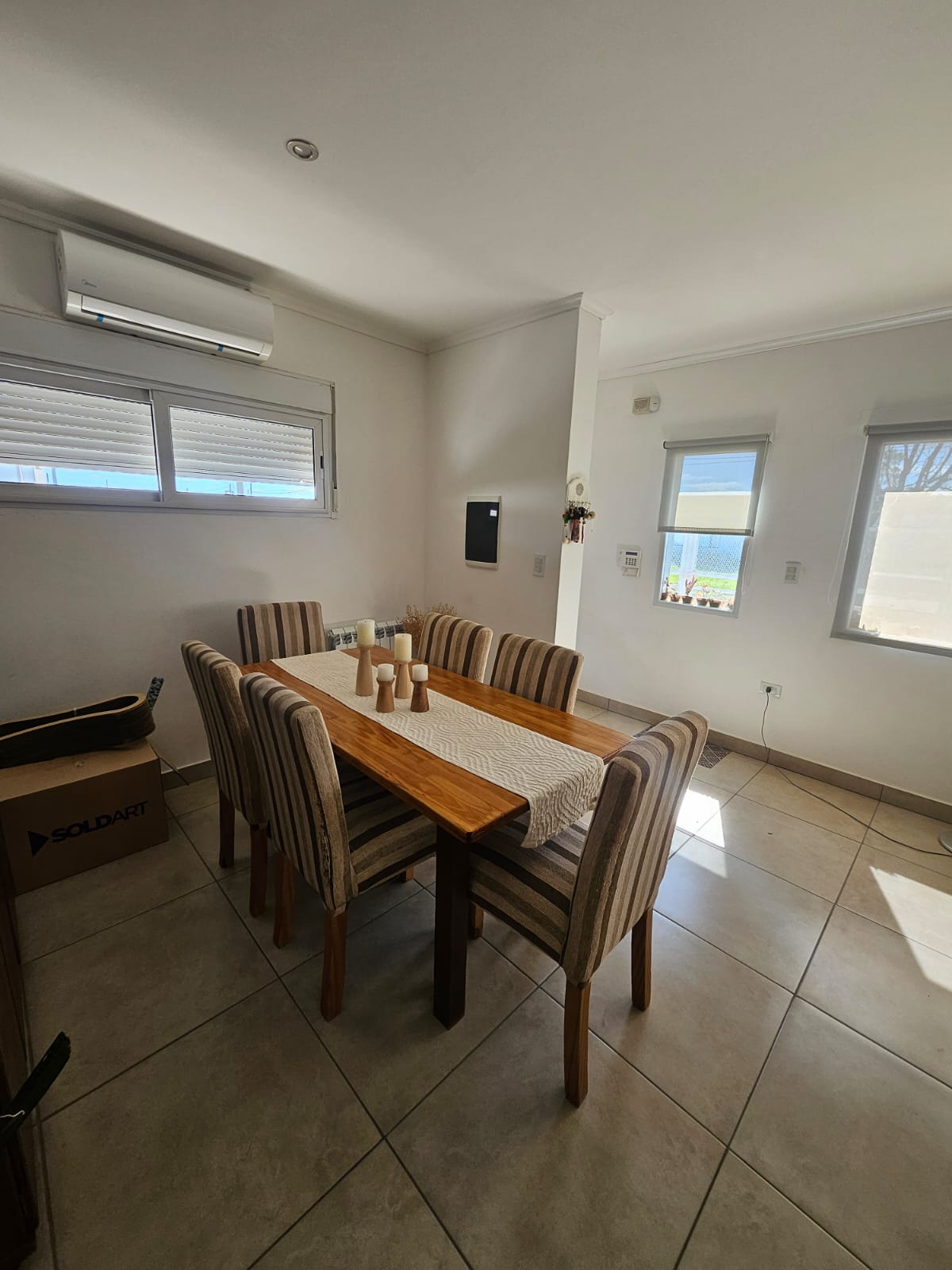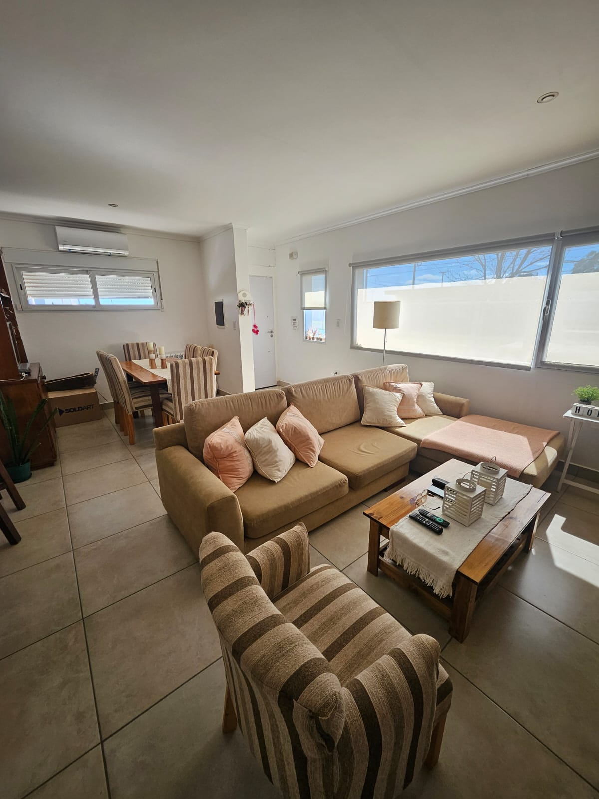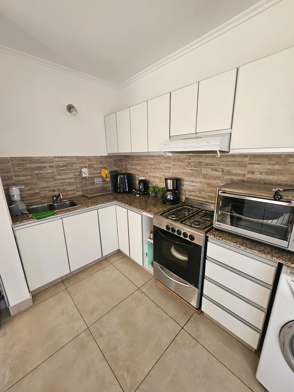 Cocina semi integrada separada por barra, equipada con horno, alacenas y bajo mesadas, con acceso a patio. Luminoso living comedor con aire acondicionado.